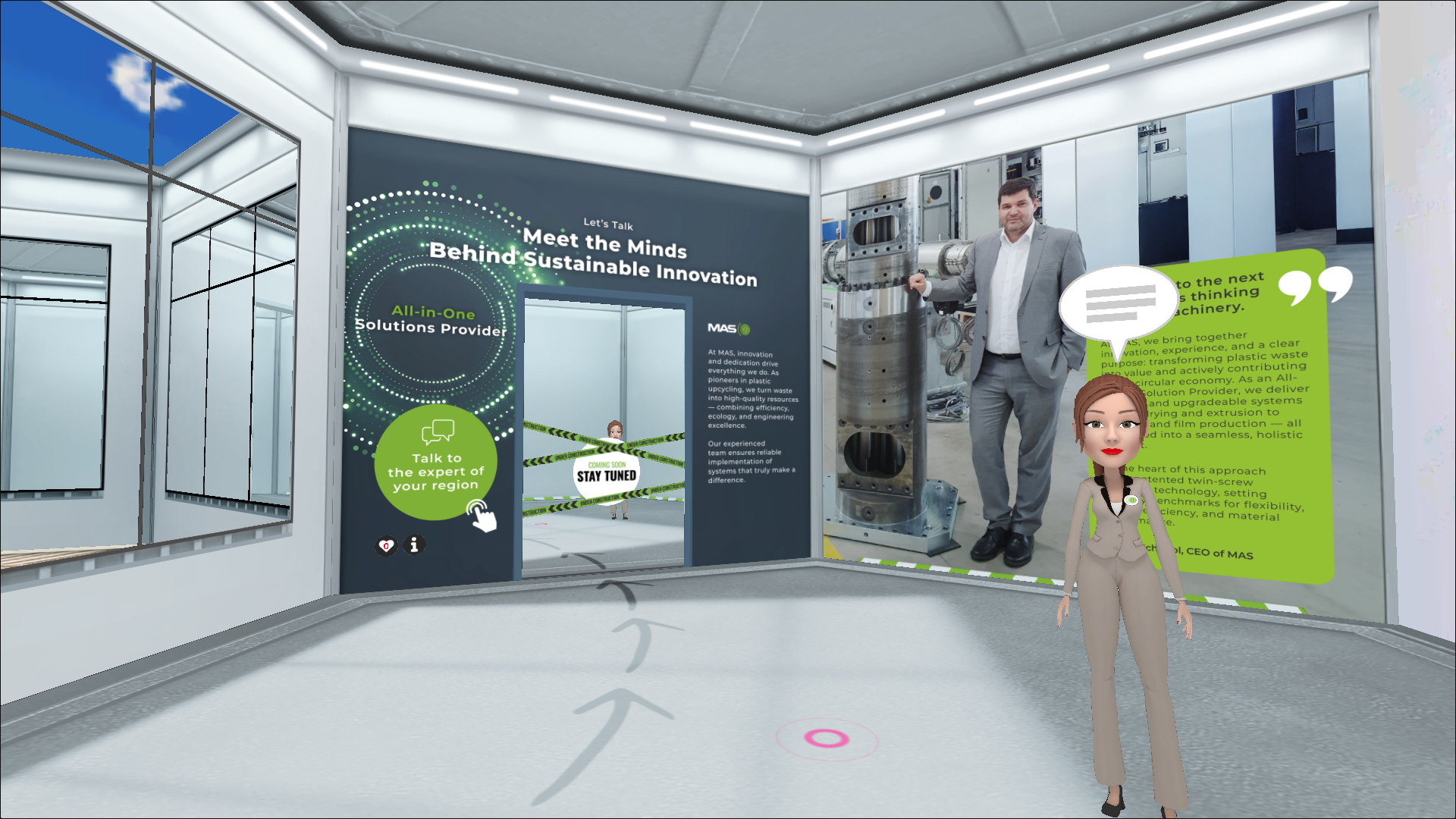Maschinen, Komponenten, Produkte und Produktionsprozesse werden als interaktive 3D-Modelle integriert, die direkt aus Ihren vorhandenen CAD-Dateien erstellt werden. Komplexe Industrieanlagen, deren Transport zu einer Messe unmöglich wäre – Doppelschneckenextruder, Automatisierungslinien, medizinische Geräte, Turbinen – lassen sich im Entscheidungsraum in Originalgröße begehen, drehen und erkunden. Animationen zeigen interne Abläufe, Schnittansichten geben Einblicke in technische Details, und interaktive Hotspots zeigen technische Spezifikationen an, sobald Interesse daran besteht.