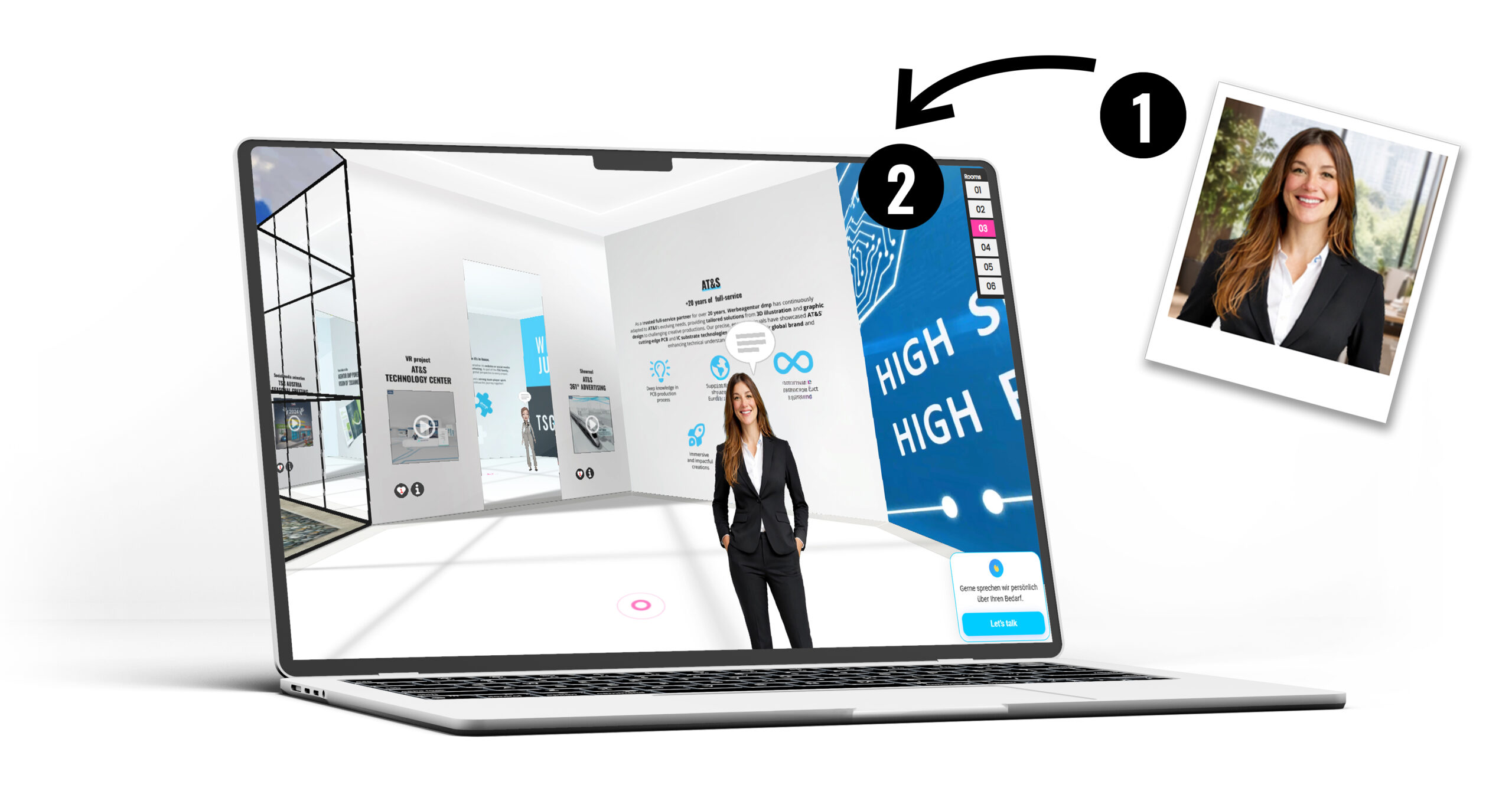 Der Ton wird räumlich wiedergegeben und an die Position im Raum gebunden, sodass Besucher den Gastgeber aus der richtigen Richtung hören, während sie sich durch den virtuellen Raum bewegen. Gastgeber können die Sprache auch dynamisch basierend auf den Browsereinstellungen des Besuchers oder einer manuellen Auswahl wechseln, wodurch dieselbe Galerie für deutsche Ingenieure, japanische Einkäufer oder spanischsprachige Partner zugänglich ist, ohne dass separate Versionen des Raums gepflegt werden müssen.
